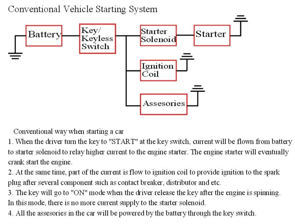 On the other hand, when the GPS gives signal that the traffic condition in 1km ahead is recovered, it will supply current to the starter solenoid for a very short period of time (ex:-200ms), so that the starter solenoid will trigger a higher current to starter to start the engine. At the same time, it also will supply current to the ignition coil to allow ignition occurred in the engine.
