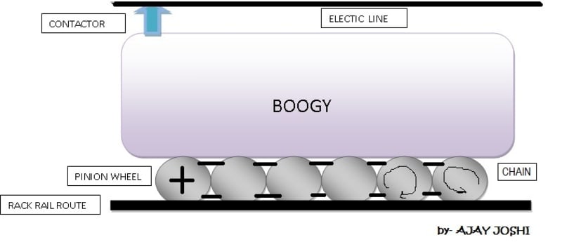 It consist of Boggy provided with pinion (Toothed Gear) wheel instead of casted (present) wheel and rail route as rack, which turns as RACK and PINION arrangement. This causes smooth functioning of rails and avoids Slipping of rail from rail route because of Proper meshing.