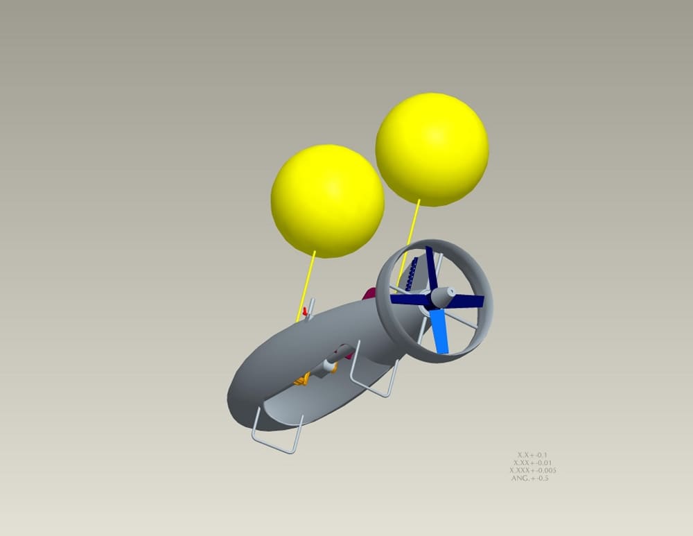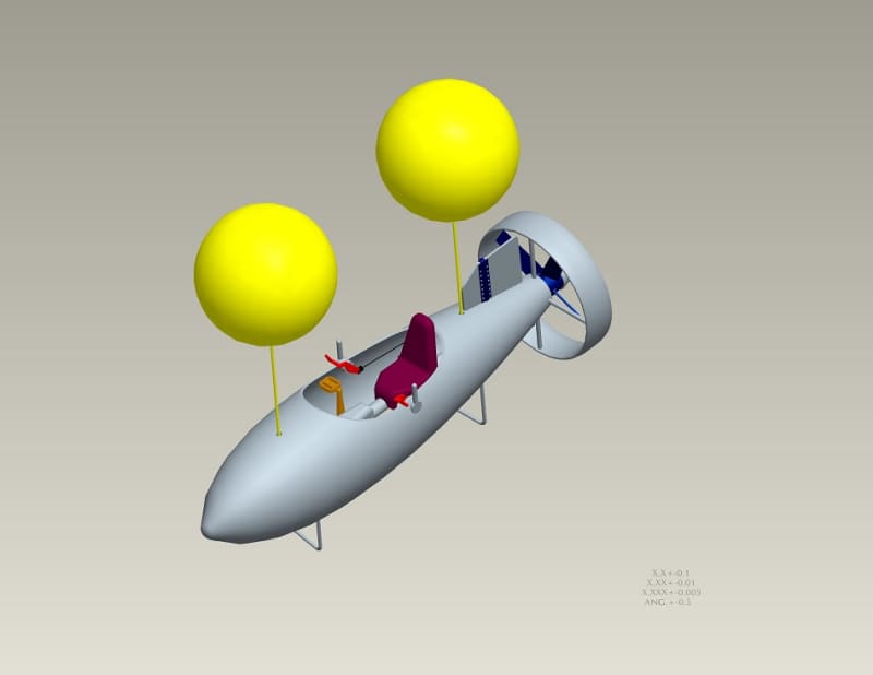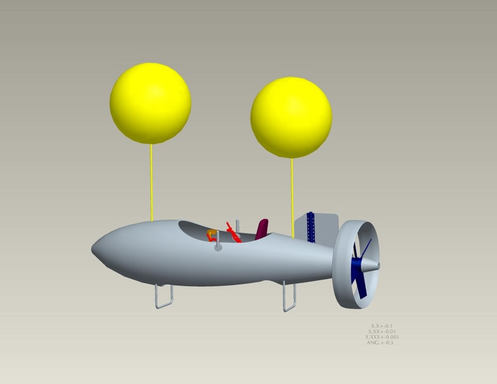 Suspended from floatation devices and an integral snorkel, it allows the operator an underwater experience just feet below the water surface. The pedal arrangement turns a rear mounted propeller and hand controlled levers which provide rudder movement for directional control.