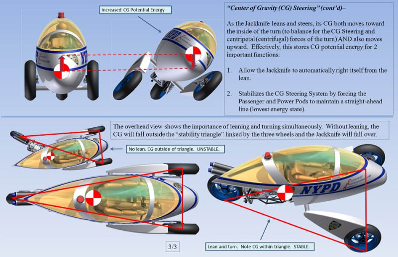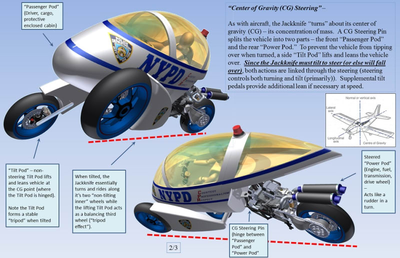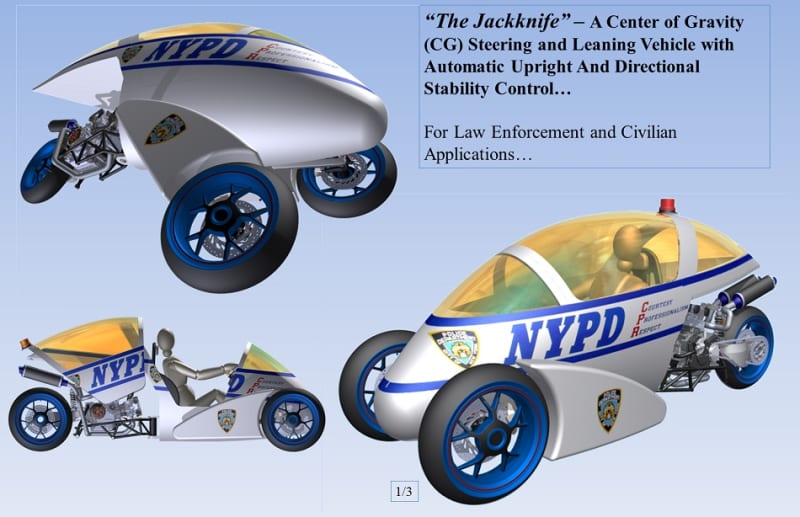 Simply enclosing a motorcycle would seem to be the obvious solutions. However, so far for technical and cost reasons, a police “cabin” (enclosed motorcycle) has defied a practical solution. The proposed “Jackknife” vehicle with the novel “Center of Gravity” Steering System (CGSS) seeks to be that practical solution.