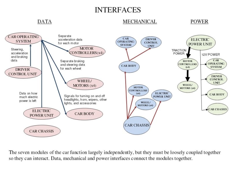 In our car, each module performs one or more functions of the car. Publicly defined interfaces connect the modules together. That lets each module be developed and tested separately.