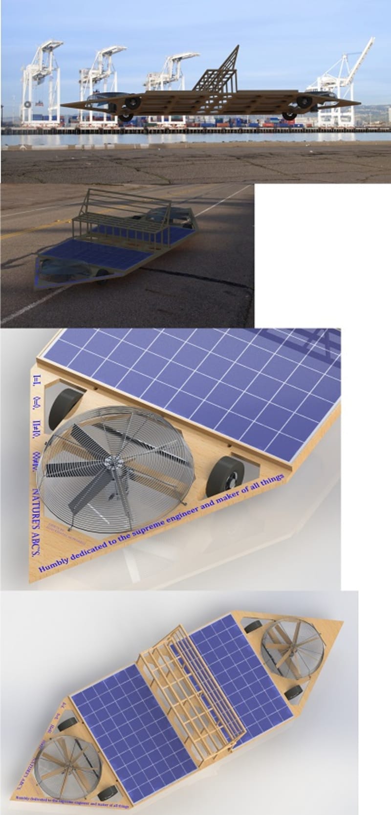 My objective was and is to build a lightweight hovercraft made from sustainable materials at the lowest possible cost for the consumer. The pictured prototype may need some refinements as with any other products being launched at first, yet it is very feasible given its weight that the two motors can lift the frame along with a 185 lbs person and propel it by using just the power generated by the two solar panels on the floor.