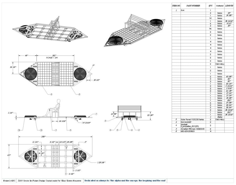 The hover frame is made of balsa wood; balsa wood has a very low density and is strong making it a very suitable material for the frame on this application, and it is also one of the most sustainable materials available. The software calculates the total frame weight to be 30 lbs. Also the metal frame on the solar panels (Yingli Green Energy, 250W PV Module, H4, PV Wire, 40mm Clear Frame, 60 Cell Poly, 15A Fuse, 226.2W PTC, YL250P-29b $259.13 each) was replaced by a balsa wood frame to reduce its weight.