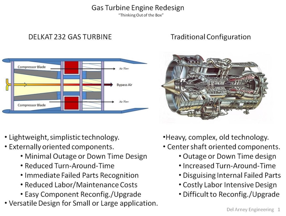 After many years of listening to Co-gens and Power Companies, globally, go into a panic for turbine parts, and having to drive every machine shop in the USA to the brink of exhaustion, working weekends and overtime to fill expedited orders, I designed a better "mouse trap." Millions of dollars are lost, due to down time, misidentified configurations, lack of parts and material to make the components. I am not rich, so I can only submit an elementary PPT of my design, with no R&D, just the experiential knowledge that this design is needed in the Power Generation Industry, to reduce the inefficient daily commerce of gas turbine parts and maintenance operations currently in place. My externally supported turbine, Delkat 232 Gas Turbine, is a simplistic design, which employs a hollow center cartridge, that can be easily removed, to access compression or turbine components, reducing turn-around-time, down time, repair costs, and increasing Outage Recovery. I am retired US Navy, and, retired from GE Energy, Atlanta, GA.