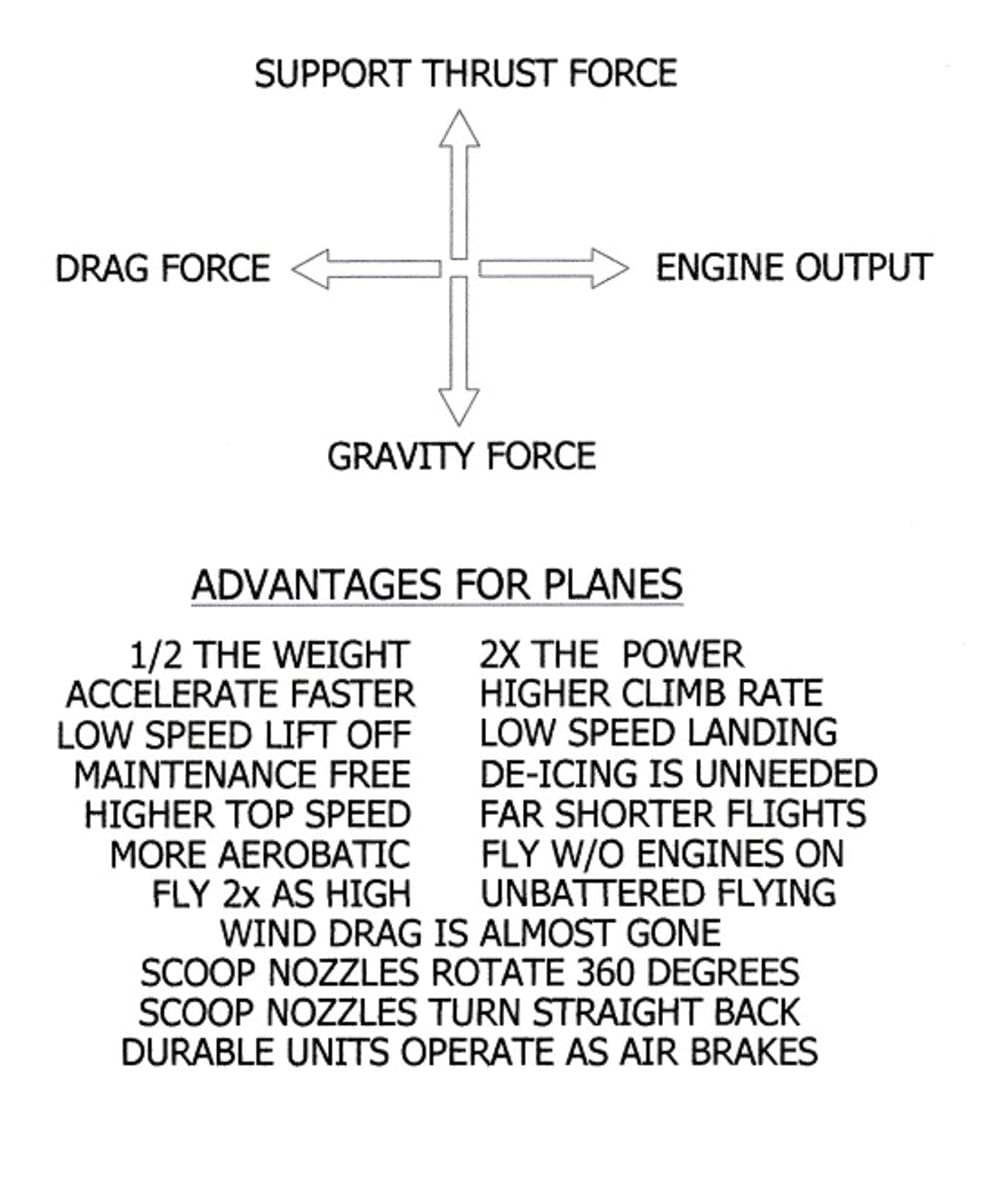 15 important features of the proposed system are: 1. Aircraft can weigh much less (about 1/2 is estimated). 2. Aircraft can accelerate faster (2x). 3. Lower speed takeoffs are possible. 4. Lower speed landings are possible. (2x). 5. Units can change position anytime to act as air brakes to rapidly decrease speed. 6. Scoop units can tilt away from the body to create higher volume, faster air from the scoop nozzles. 7. Aircraft can slowly glide to land when the scoop units tilt out from the body. 8. Aircraft can have a higher top speed. 9. Aircraft can have shorter flight times. 10. Aircraft can fly higher (2x). 11. Aircraft can climb at a higher rate. 12. Drag can be lower because air slipstreams through the hollow units without slowing down when the units aren't operating. 13. Aircraft can be more aerobatic (esp. fighters in combat) even at low speeds. 14. Flying can be possible without engines running (must prove the method) to reduce pollution & save fuel because engines may operate only to get to altitude. 15. Scoop nozzles at 90 degrees can rotate 360 degrees (positioning them up can force a plane to descend rapidly). Nozzles can vector air diagonally at 30 degrees from level forward and then pivot 150 degrees to send air straight back.