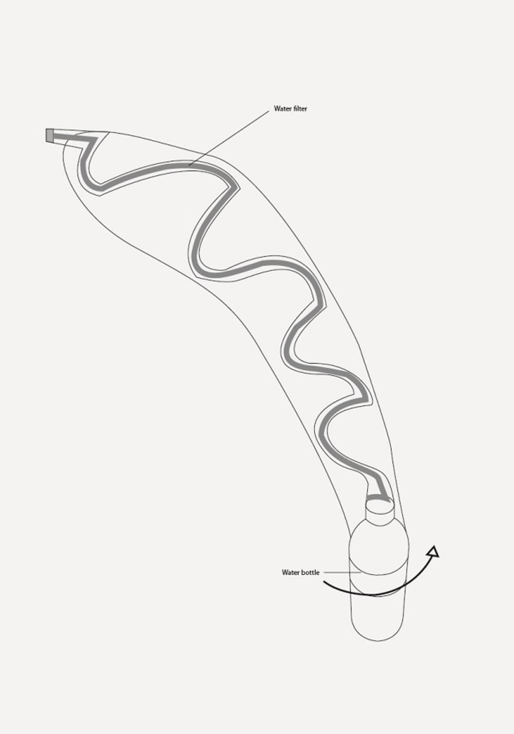 Falling Water with Filter allows the quick replacement of the caps on bottled water, with a cap that allows the bottles to fly and gently descend to the ground with their precious cargo. This cargo, which is fresh water could immediately reach the people most in need. However, the limited contents of the water bottle is enhanced by the winged cap that serves a secondary purpose. Once empty, the winged bottle cap can be unscrewed and used as a filter to continue to provide potable water to disaster victims.