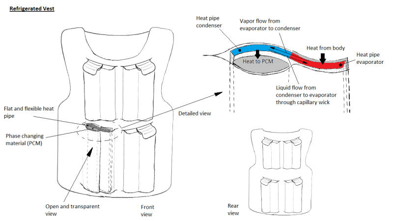 The concept of this vest is to have a passive cooling system based on two phase changing heat transfer features; heat pipe technology for high level heat transfer and phase changing materials for heat storage.