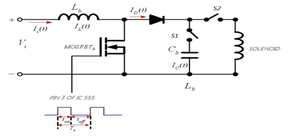 The Charger Assembly consists of the following components – A rechargeable DC battery, IC 555 (in astable mode), an n-channel MOSFET, diode, inductor, two capacitors connected in parallel and a solenoid. The square wave output is fed to the power MOSFET. As a result, forcing it to switch between on and off states. A very high back emf is generated to counterbalance the discharging current into the capacitor. As a result the capacitors are charged to very high voltages in am matter of 15-20 seconds.