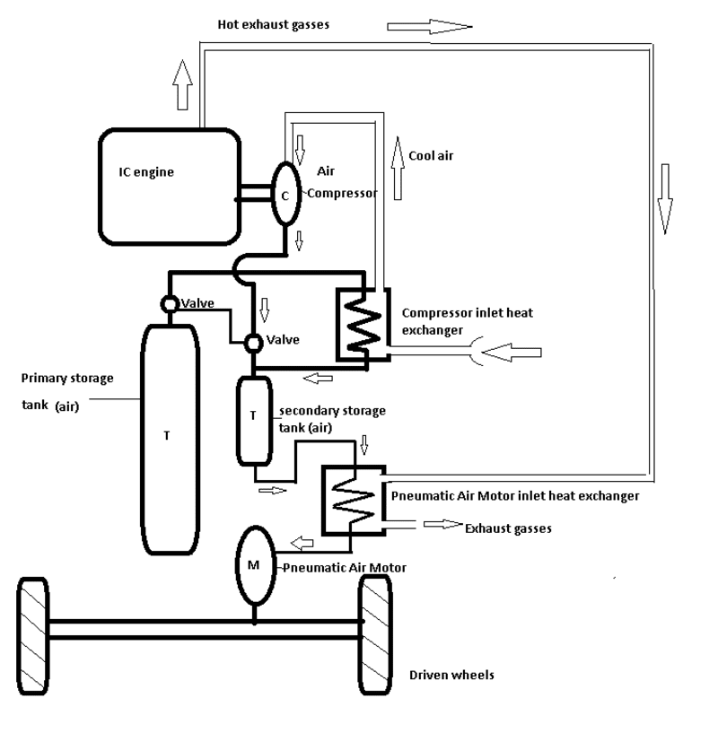 As shown in the figure, the main components of the system are an IC engine, an air compressor, a pneumatic air motor, two heat exchangers and two air storage tanks. For short journeys the vehicle can work only on pneumatic power stored in the tank which can be filled from any power source at home. For long journeys it can uses both the compressed air in the tank and an IC engine.