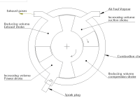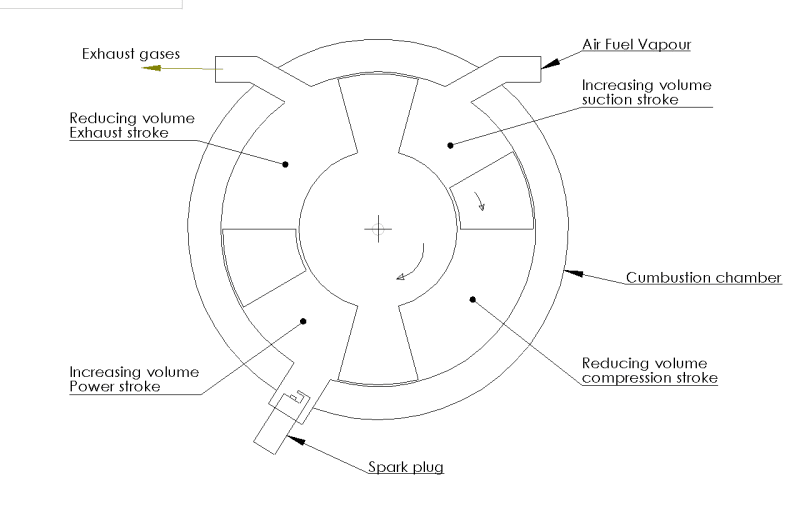 The compartment undergoing increase in volume is provided with an opening in the chamber to allow the air enter the compartment ( suction stroke ). The adjacent compartment undergoing reduction in volume causes to expel air ( exhaust stroke ) through another opening . One opening is provided at a suitable place where maximum compression occurs .Here a spark plug is fitted to initiate firing & cause expansion stroke. This is as shown in the attached sketch. When the compartments rotate , it can be observed that at a time all the 4 strokes of the cycle are occurring in succession & thus in one complete rotation it will give 4 power strokes. In comparison with standard single cylinder 4 stroke engine, where one power stroke occurs in 2 shaft rotations, this rotary engine will give 8 power strokes in same no. of rotations. Hence for the same engine power rating, this engine will give very smooth torque , nearly as average torque without heavy peaks or fluctuations.