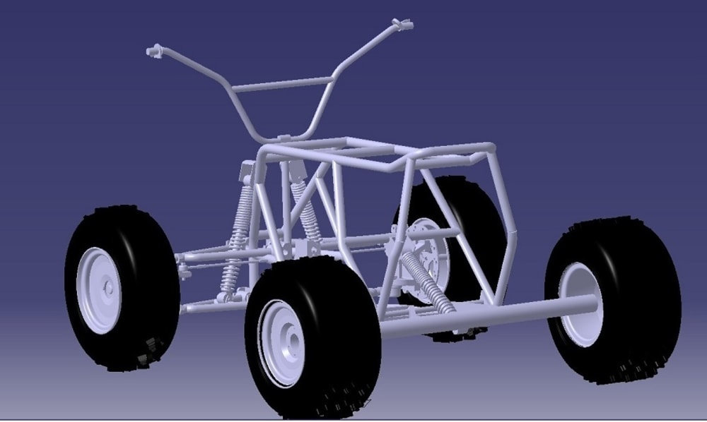 We can build a QUAD-BIKE, and also we can design and fabricate it for an extremely low budget. It provides a platform for the undergraduate students to apply the principles of engineering science to expose their proficiency in the automotive world.The first main design goal is to keep the bike to maximum strength as possible. So, build the chassis and body out of AISI 4130 Alloy Steel. And for Steering Ackermann steering is a very important aspect of the steering system design. Applying this to Four-bar linkage steering.For to use the bike in All-Terrain the Quad-Bike needs to have a well designed and adjustable suspension system. A key component of the suspension design is the interface between the chassis and the suspension system. So,it is optimum require to use Double-Wishbone Suspension at Front and Mono-Suspension at Rear. Also for the power-train the best to use single front and reverse gear for easy shifting purpose rather than five to six gears which will complicate the driver to move on. For a Quad-Bike it is preferred to use two Disc brakes at front for two wheels and one disc brake on shaft also most commonly brakes use friction to convert kinetic energy into heat, though other methods of energy conversion may be employed. For example, regenerative braking converts much of the energy to electrical energy, which may be stored for later use. Other methods convert kinetic into potential energy in such stored forms as pressurized air or pressurized oil.Since the vehicle is an off-road vehicle it is better to choose tube less tyres for rear wheels and with bigger tyre threads. Less traction tyres provides high acceleration which is required for this QUAD vehicle.
