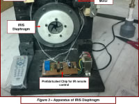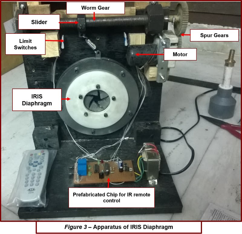 The prototype shall involve the fabricated IRIS Diaphragm mounted on a wooden base. Actuation of blades i.e. movement of blades will be done by attaching a spring which is further connected to a slider mounted on a worm gear. Worm gear is rotated using a simple 24V DC motor and by using simple gear ratios. As shown in the figure, two limit switches have been connected to the wooden mount and they are actuated via the slider, which was mounted on the worm gear. Slider covers the span of worm gear, pulling the spring along with it such that linear distance covered by slider is sufficient for movement of the actuating ring by 350.