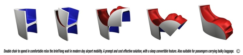 Patent description: A double seat that keeps baggage safe. French Patent 2Nov2012, number 0511230, n. publication 2892906, converted in European Pantent PCT 06831063.0-1653, ref.8F945cas1, 10Jan2014. The invention consists of a seat made of two shells which can be overlapped or set side by side (juxtaposed) and which are connected by a rotation joint. The shells are designed in such a way as to enable the formation of a seat when they are overlapped, or a chaise-longue when they are juxtaposed, providing a closed space below that shields baggage, small belongings and other objects. Patented.