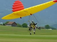 Thrust will be supplied by a very large diameter propeller, like those used on other human flight craft. Large, slow rotating propellors are the most energy efficient. As with a bicycle, the forward velocity will be a factor of the power output of the human rider. The handle bars of the bike are connected to the support structure of the wing to provide directional control as with any “weight-shifted” ultralight aircraft. The propeller is to the rear of the rider, and does not need a safety cage since the rotation is very slow.