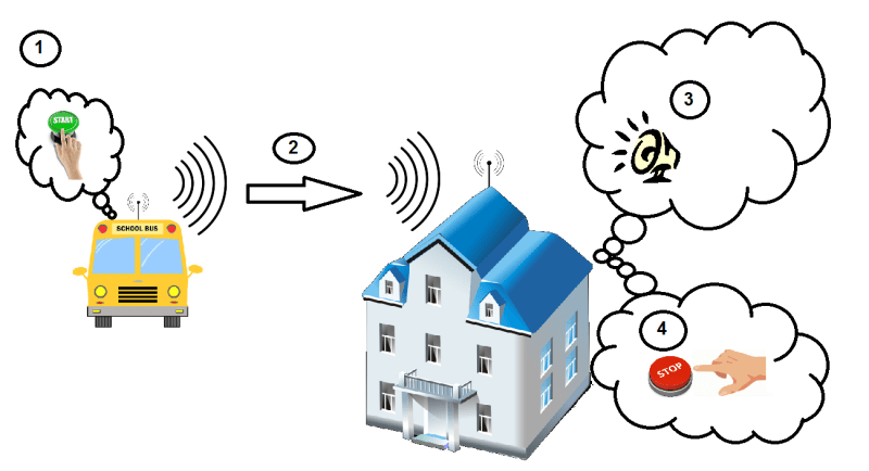 As the driver come to the student's home just by pushing the button on the device then it will send a secured signal which will activate the receiver inside the student's home to alert the family (this alert will be just only inside the student's home) that the bus is waiting outside without making horn noise. This alert can be stopped just by pressing a stop button on the receiver.
