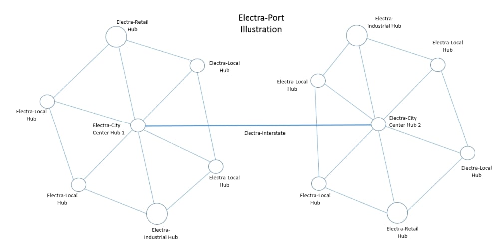 Electra-Port would basically be an updated trolley system of overhead wires for power, modern electric busses for the transporter and computer control for safety and efficiency. City-wide transportation would use the standard spoke-and-wheel system to gather and deliver commuters to retail, industrial or city center for work, shopping, etc. Neighborhoods would have Electra-Vans, small electric-powered busses, with the power wires suspended from modified lamp posts and use embedded magnets for computer-driverless operation. The neighborhood commuters would be delivered to the spoke-bus hubs where they would transfer to Electra-Carriers, larger busses, for further travel to work, shopping, sports, etc.