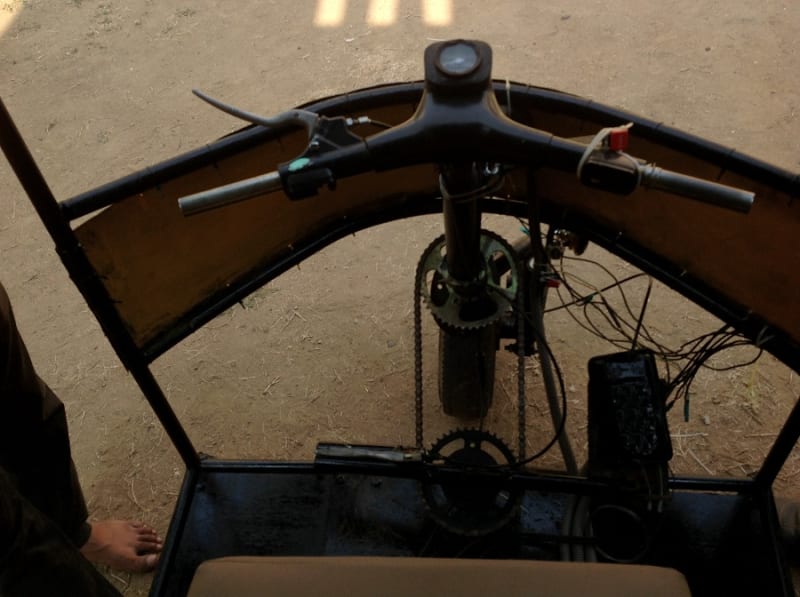 It consists of a fork system of an auto rickshaw. The fork is mounted at a certain inclination. A sprocket is attached to it at an inclination by means of bolts and nuts. The fork has an axle at its bottom to which the tire is connected.
