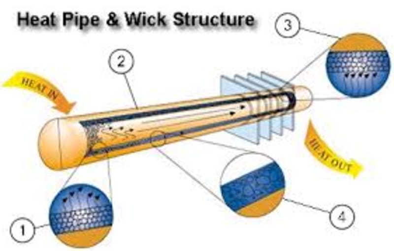 The material for the heat pipe should be selected by considering the temperature limits of the system. Copper can be used for domestic applications because of its high thermal conductivity. The wick material (inner wall of heat pipe) can be made by copper powder sintering.