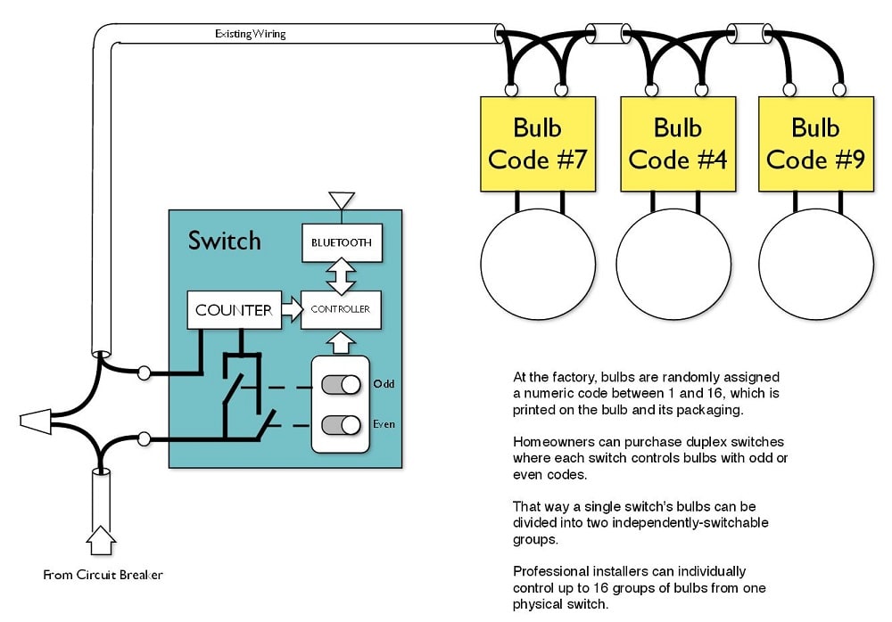 Each bulb is equipped with a low-power radio-frequency (RF) receiver, and each switch is supplied with a corresponding transmitter. In this way it is similar to several commercially-available lighting systems.