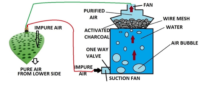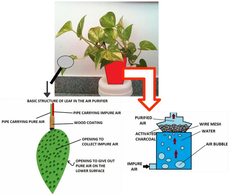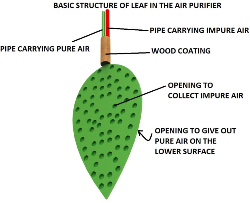 My concept proposes an air purifier that works similarly to natural plant leaves.The leaves of this artificial decoration plant will have holes or openings in the upper surface through which the impure air will be sucked in.This impure air is released at the bottom of a container filled with air, which results in the formation of air bubbles in water. These air bubbles reach the top of the container after passing through the water When they pass through the water the impurities and dust present in the air is washed away. This filtered air again passes through a fine mesh and activated charcoal, which will absorb bad odors from the air.The pure air will be released through the openings in the lower surface of the leaves.