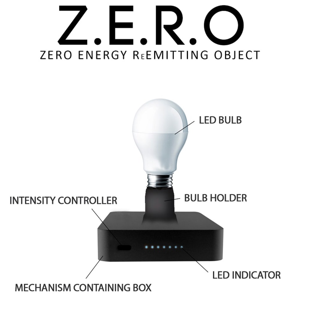 Z.E.R.O ( Zero Energy Re Emitting Object ) works on the principle of magnetic force repulsion.