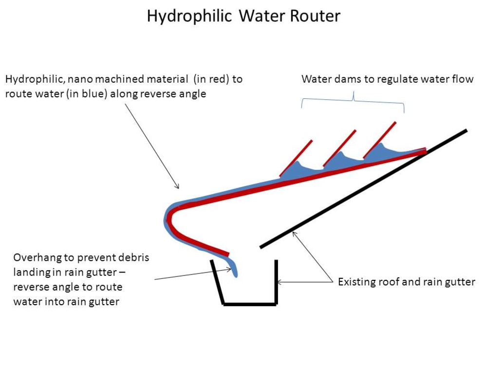 The hydrophilic material can be nano-machined to increase the surface area the water clings to. Water dams are part of the system to regulate the flow rate of water sent to the overhang region. No modification of the existing roof or rain gutters is required. The cross-section shown illustrates the components of the proposed system: