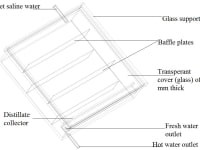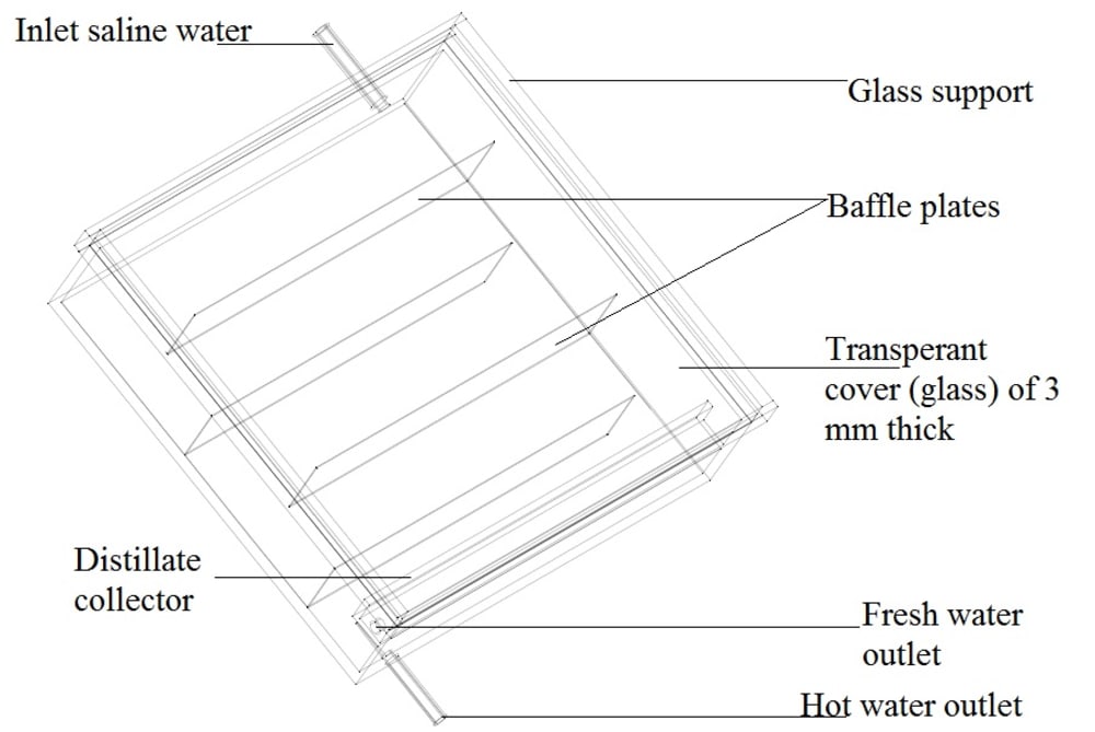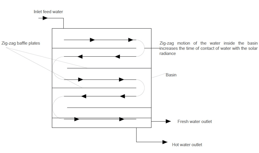 A solar still with a basin area of 0.65*0.65 m2 was fabricated. The height of the solar still was maintained to be 0.1m for avoiding the shadow effect which normally falls from the side walls to the water area. The consecutive distance between each baffle plates were measured to be 0.13m. The zig-zag motion of the water covers the entire surface area of the basin by absorbing the heat, which in turns increasing the water temperature.