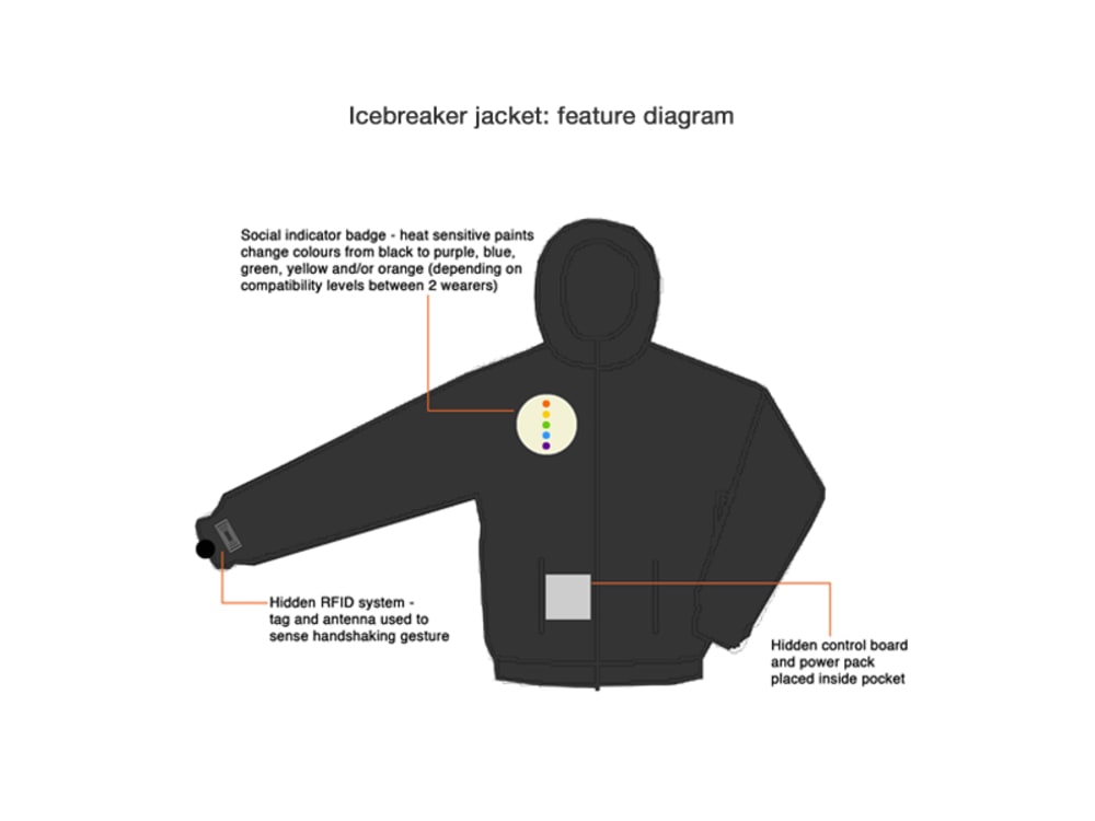 Following the ideas of calm computing and natural interaction, Wearable Icebreaker is an activity-aware system that is designed to facilitate real-world interaction in a natural manner. One of our prototypes, the Icebreaker jacket, puts the user in control by adopting a handshake as the trigger for the exchange of social profile and preferences between 2 wearers. A short-range radio-frequency identification (RFID) system hidden in the cuff gives the wearer full control over his/her information; the wearer decides when and whom to exchange their private data with. A heat-sensitive circuit is implemented in a textile badge, displaying a social cue that shows how much the wearers are compatible with one another. Rapidly, black dots on the badge change into colours – higher matched scores trigger warmer colours and in vice versa. 73% of test participants in our pilot study reported the jacket made their speed-dating experience easier.