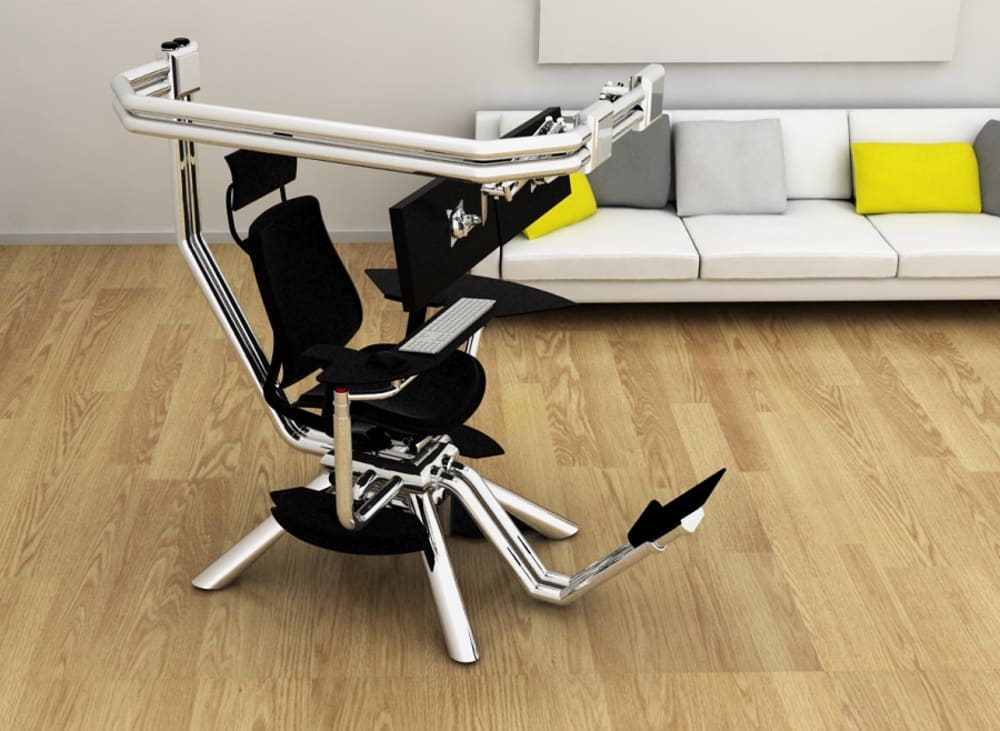 The 'Chair-e Line' combines a chair, a footrest, a desk surface and a computer together with peripheral devices both static and mobile. The complete line of workstations both supports and adjusts to the anthropomorphizing body sizes from the 5th — 95th percentile of the user population, providing unobtrusive stable support while responding to individual users’ needs, positions and interactions.