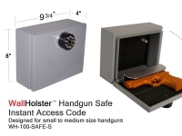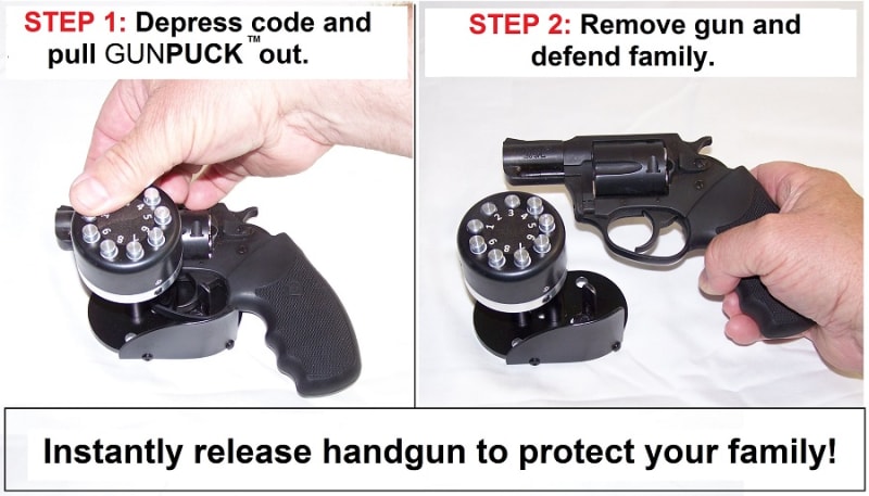 Using LockPuck technology we created two gun safety products and one child safety product. The WallHolster™, the WallHolster™ Handgun Safe and PuckIT™. Built into each product are two layers of numeric code security. One or more buttons must be rotated prior to the “unlock code” being depressed. The unlock code can also consist of one or more numbers. There are over 314 million code permutations available.