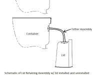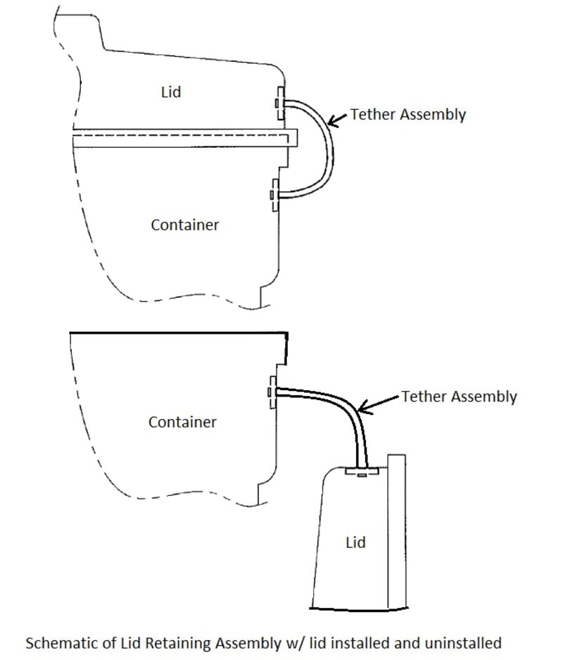 The lid retaining system does not mount permanently to the thin walled plastic where the tether is allowed to rotate and translate through the holes in the lid and container. The retaining disks on either end of the tether provide a limiter of movement only . Attaching the lid restraining system in this manner provides a long and robust product life. When the lid is removed the retaining system holds the lid to the side of the container out of the way of the user.