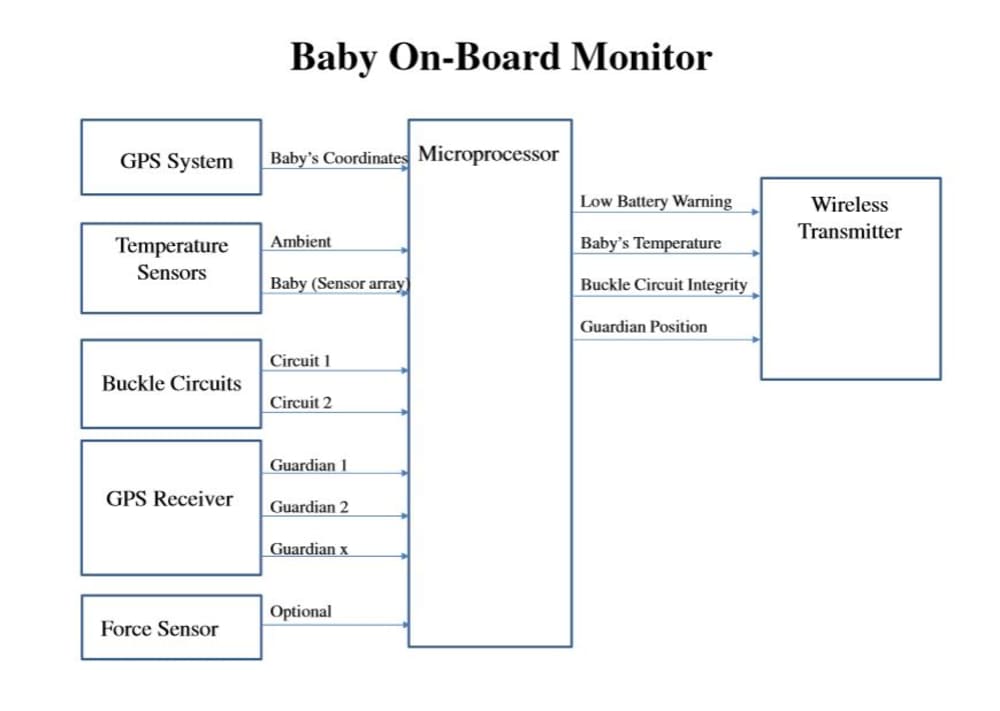 The baby temperature sensor would determine that a child is present within the seat and act as the primary arming device. Once the system is armed, the system will monitor the baby’s temperature, ambient temperature conditions, integrity of the harness system, and the relative distance between the baby and the nearest guardian.