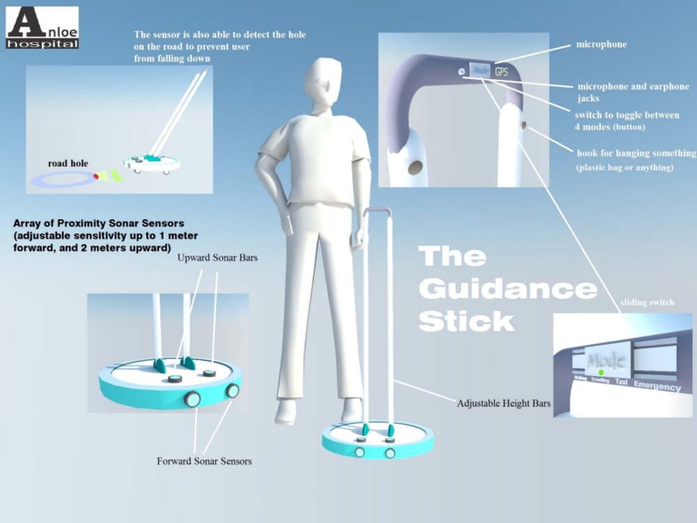 The Guidance-Stick (GS) is made of lightweight hard plastic, with adjustable height, and is attached to a wheeled-base with proximity sensors. The sensors detect obstacles within an adjustable radius of up to 1 meter forward, and 2 meters upwards.