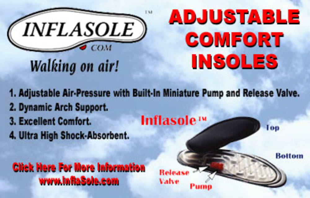 INFLASOLE™ is the only insole/orthotics that enables heel spurs sufferers to inflate their INFLASOLE™ with enough air pressure, according their weight, so that their heel (heel bone) doesn't touch hard surface of their shoes, but rather float on air pillow.