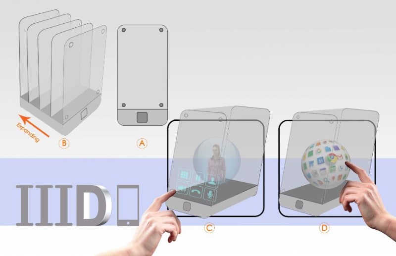 Our idea is to have a regular smartphone which can be used for daily habit (Fig. A). But, it can be expanded to a real 3D phone (Fig. B). We can use a modified version of True 3D Display using Laser plasma technology by Burton Inc. to implement this idea.
