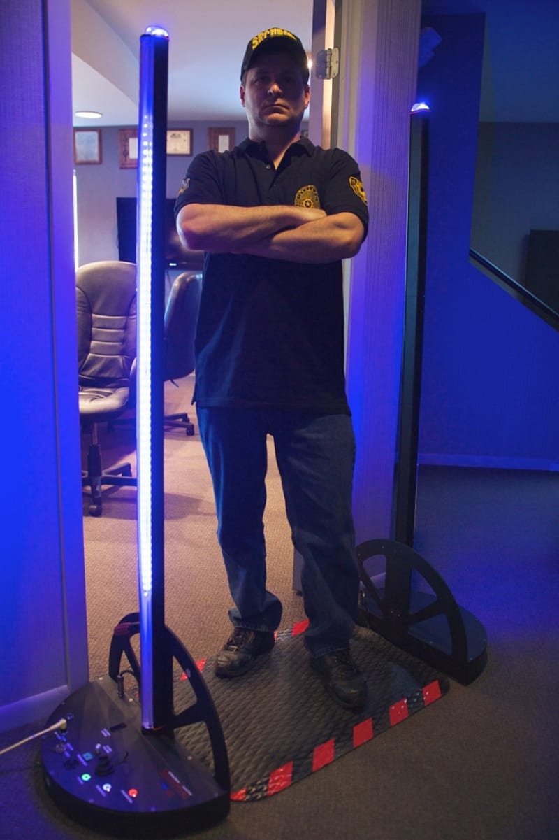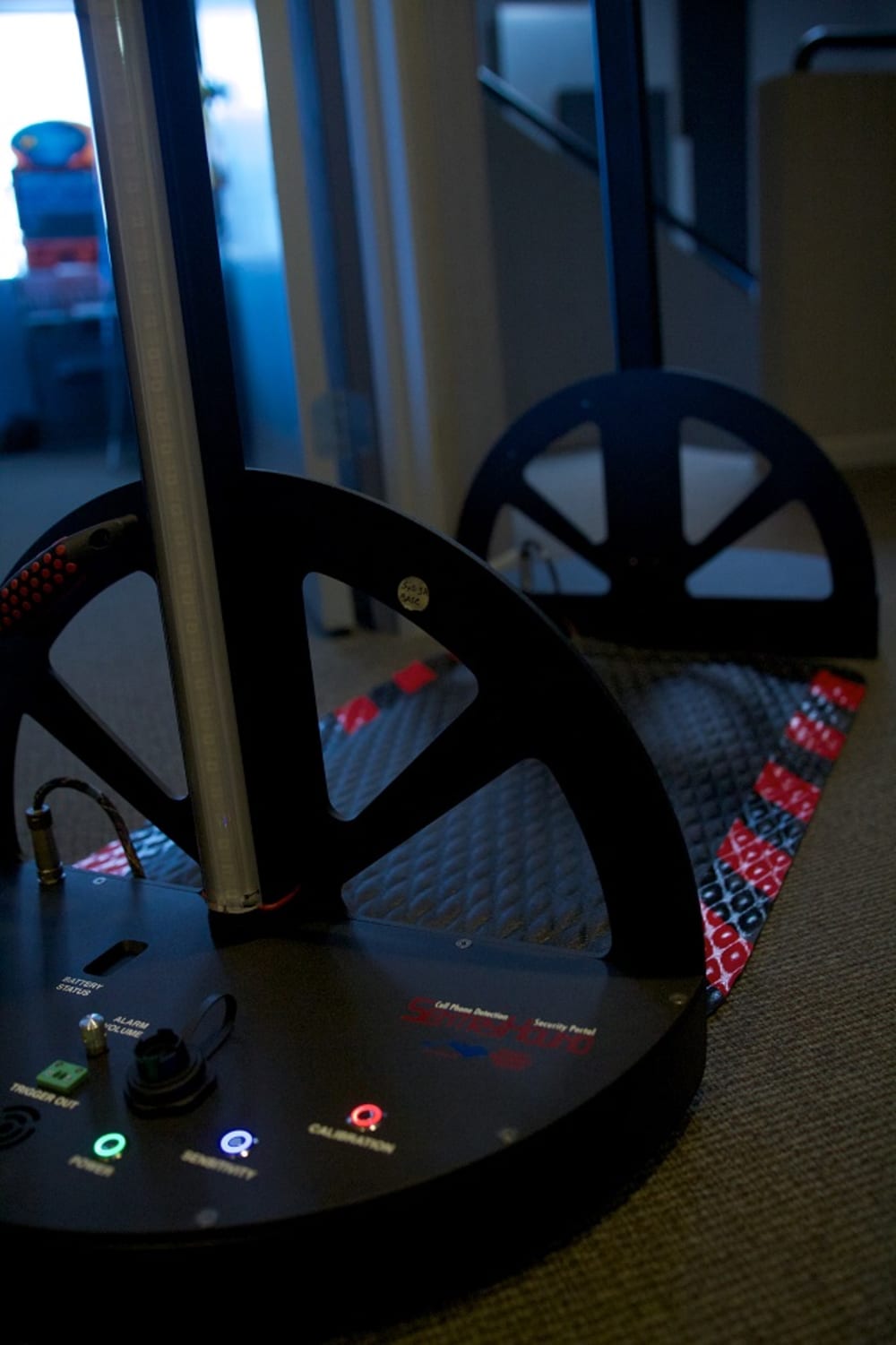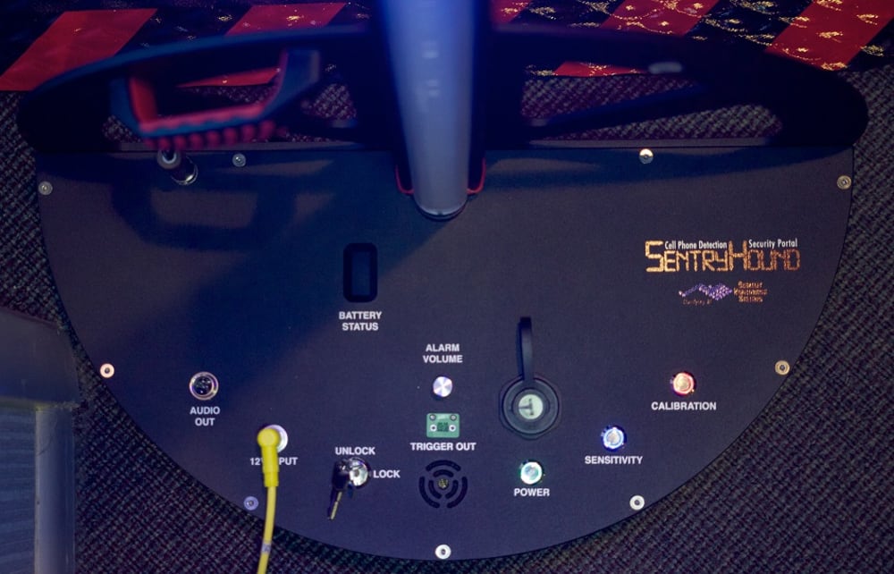 SentryHound™ cell phone detection security portal is triggered when cell phones (or other ferromagnetic material) pass by its sensors. This type of installation is especially useful for security personnel looking to detect any cell phones (ON or OFF) as well as some weapons including knives and guns without invasive and time-consuming searches. Since SentryHound is triggered by specific components found in mobile phones, time, money and resources normally spent using standard metal detectors are saved. This makes SentryHound the perfect compliment to teams securing concert halls, courtrooms, conference rooms, government secure facilities (SCIFs), and many more public and private areas from cell phones. SentryHound contains (12) independent, ultra-sensitive zones between 2 poles to detect cell phones from head to toe and even indicate location of the hidden item with glowing LED alerts and sirens. These LED zones "lock" onto any mobile phone hidden in a pocket, bag or purse. Setup and takedown of SentryHound is easy and its flexible power requirements (plug in for AC or use it's internal DC battery) allow it to run all day. Ten levels of sensitivity and auto calibration ensure that SentryHound is always on the trail of hidden or contraband phones. SentryHound is designed and manufactured in the U.S.A.
