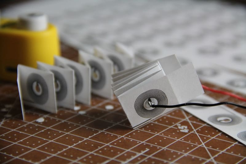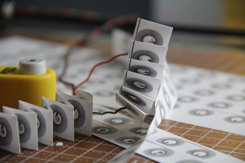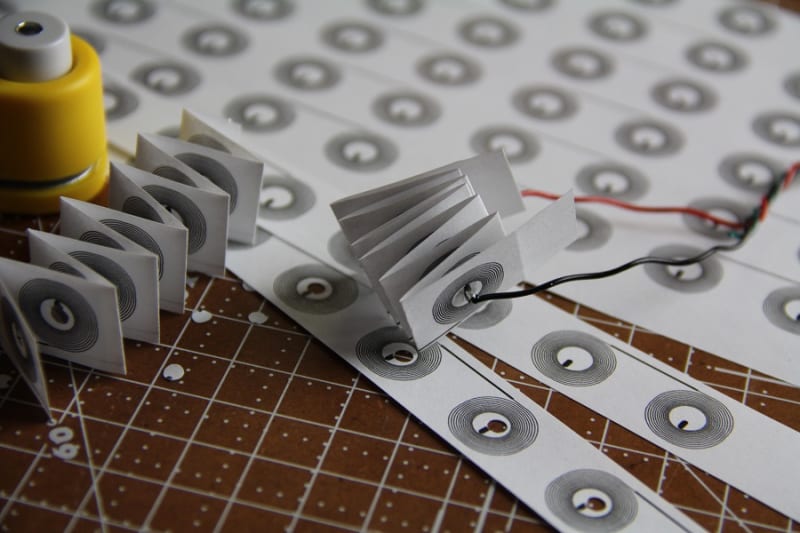 unconventional materials is now possible. This project involves printing electromagnetic coils onto both sides of a paper substrate. With a simple hole punch the coil circuits can be connected in series with conductive ink, glue or foil.