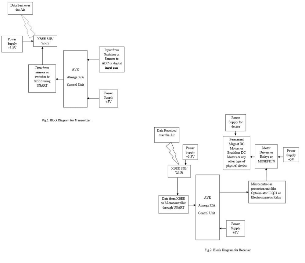 The microcontrollers used in the design are the AVR ATMEGA 32A Microcontrollers. The design can make use of any microcontroller having USART. The interface utilizes the USART built-in peripheral of the AVR microcontrollers for serial communication. Thus data is sent from the microcontroller to the wireless modules using USART and received from wireless module using the same.