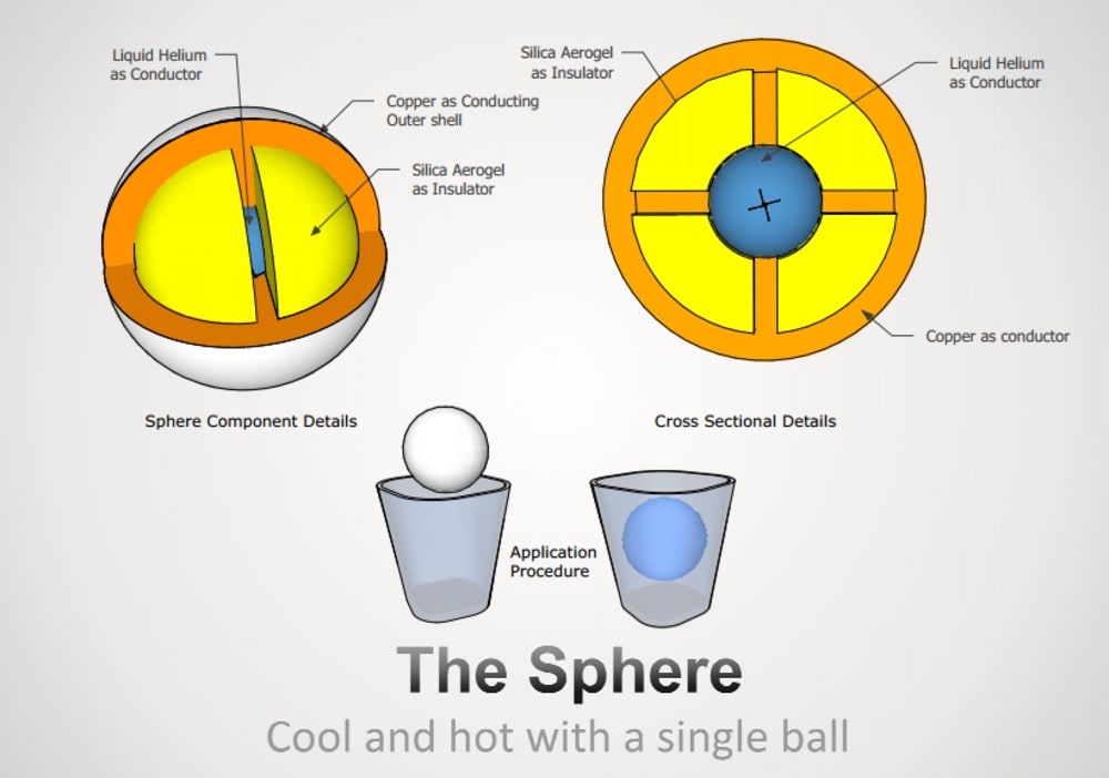 Introducing The Sphere, which is low in cost, reusable, chargeable and utmost a safe product that can cool and heat water in an easy way. The Sphere is a round shaped ball combination of three different layers which absorbs & releases energy in just a short time. This Sphere ball will be inserted into any beverages and within seconds, the beverages will be either hot or cold according to the choice of customer. Spheres are charged initially before inserting into beverages by simply putting them into the precooled and preheated water.