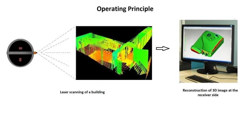 The user has a PC with GPS connectivity. A wireless communication is established between the aerial robot and the PC. In case of scanning an open area (like a forest), the user can set the coverage area for scanning through the GPS. This information is transferred to the aerial robot and scanning is initialized. PC receives the scanned data and separate software regenerates the 3D holograms of the scanned objects.
