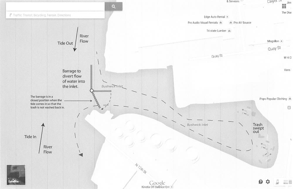 Inlets in tidal basisns have a habit of collecting trash and eventually killing the life in them. By putting a gate at the opening that channels water into the inlet with the outgoing tide, we can sweep the debris and channel fresh water into the inlets. Automated opening and closing of the gate allows the incoming tide to flow past the inlet and not deposit any more trash into it.