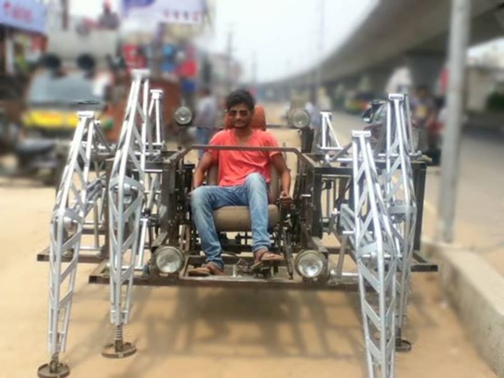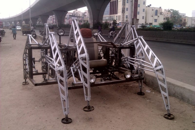 The first power source was two petrol two stoke engines (150cc) one is for right four legs and another is for left four legs. the power transmission from the engines to the legs will be done by chain drives provided for each leg. controlling of this robot is very easy and it walks farward, backward and takes turn just like an excavater.The vehicle has a carrying capacity of one person and a maximum speed of around 4 feet per second (1.2 m/s), a "brisk walking speed". it was made in just 45 days(March & April-2014) as a final project of mechanical engineering to submitt in the college.