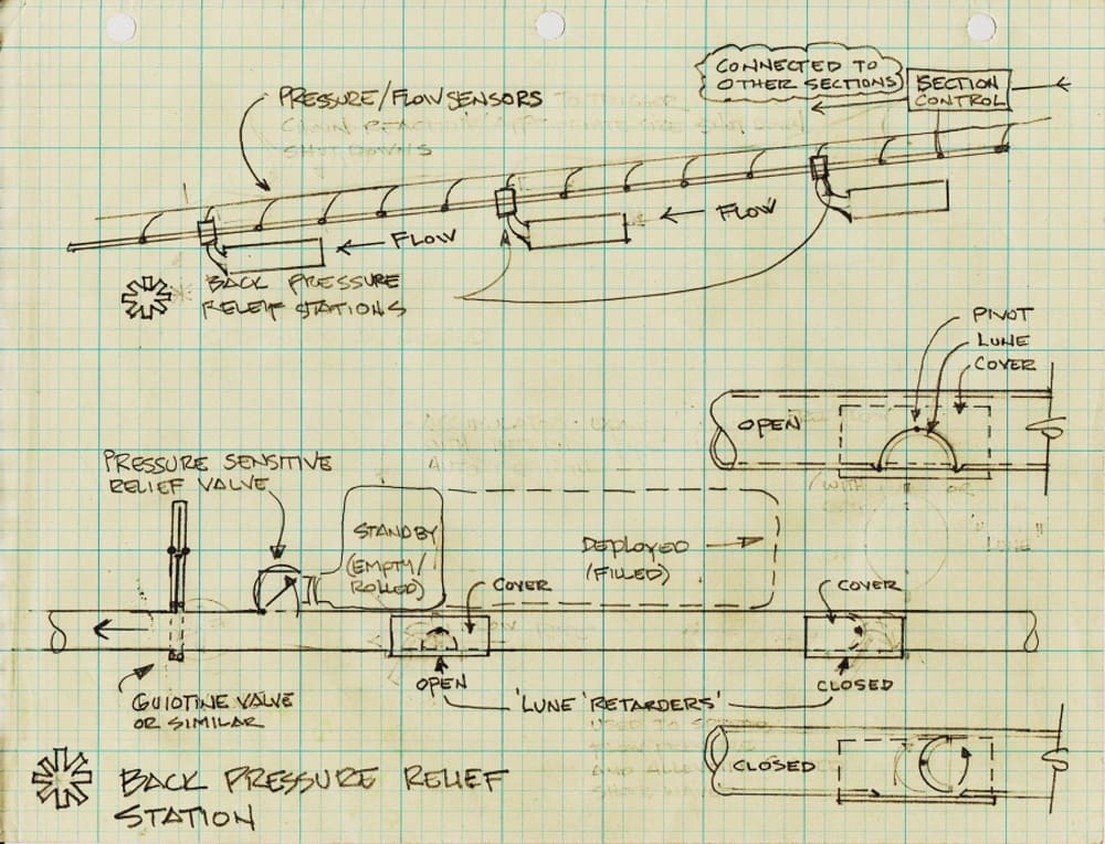 less twice the wall thickness, halfway through the pipe. The shape that this cuts out, called a lune, with appropriate relief, may be pivoted about an axis through the vertex points which are diametrically opposed to partially or fully block flow. The wall where the lune was cut away may be replaced by welding a covering on the outside of the pipe. An actuator, controlled and powered by the "additional controller" above. Upon sensing a fault, the lune would quickly pivot part way to retard the flow and slowly continue till blocking it altogether. A plurality of these retarders are spaced along the line and trap portions of the fluid at segments along the line's length.