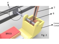 The proposed machine intends to improve the present method by mechanizing most of the tasks that require skill and time. It is comprised of a cement layer (item no. 1 in Fig. 1), followed by a brick layer (2), followed by a roller (3). The operator pushes the whole system horizontally by means of a handle (4), which is supported by a hydraulic jack (not shown in the figure). The hydraulic jack is also used to raise the entire setup to lay subsequent layers of bricks. Linear movement imparted by the operator is converted to rotational motion by a rack and pinion system (5) which is again converted to vertical linear motion using another pinion-rack system (6), which in turn powers a piston (7) fitted into the cement container. The piston pushes the cement out of the container through an opening whose size can be adjusted to give different thicknesses for the cement layer. Once a layer of cement has been laid, the brick layer (2), which contains slots and guide ways so as to hold several bricks at once in proper alignment, is used to place the bricks on top of the cement layer. This is followed by compression of the bricks by a roller (3) attached to the brick layer so that a uniform horizontal level is maintained.