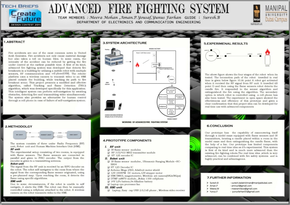 The project idea we try to implement is first of its kind. We are currently working on an experimental prototype. Prototype consists of three wheel Arduinomega2560 controlled robot with flame sensor modules, wireless camera, ultra sonic sensor, GSM/mobile with DTMF module, RF receiver unit and magnetometer. Installation of IR receivers &transmitters along with sensors inside the building and a Human Interface Module (HMI) is mandatory for this project.