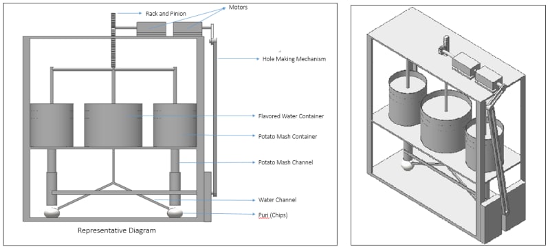 India is a nation renowned for its street-food and Paanipuri is one of those delicacies which attracts every Indian. However, lack of hygiene of Indian vendors remains a major concern with this mouth-watering dish. While the number of cases of typhoid, jaundice, cholera and gastrointestinal diseases remain high, the attraction for this dish never dies off. In the simplest terms, Paanipuri consists of hollow, oval shaped, fried and crisp chip stuffed with spiced potato mash and flavored water. The problem of hygiene originates from the way the vendor puts them together with bare hand and the surroundings in which the dish is prepared. Further, the chips are very fragile. A small mistake in making hole may break the whole chip. As panipuri is served individually and only one piece at a time, it becomes difficult to serve many people simultaneously. So there is also scope to improve the speed of serving by parallel stuffing.