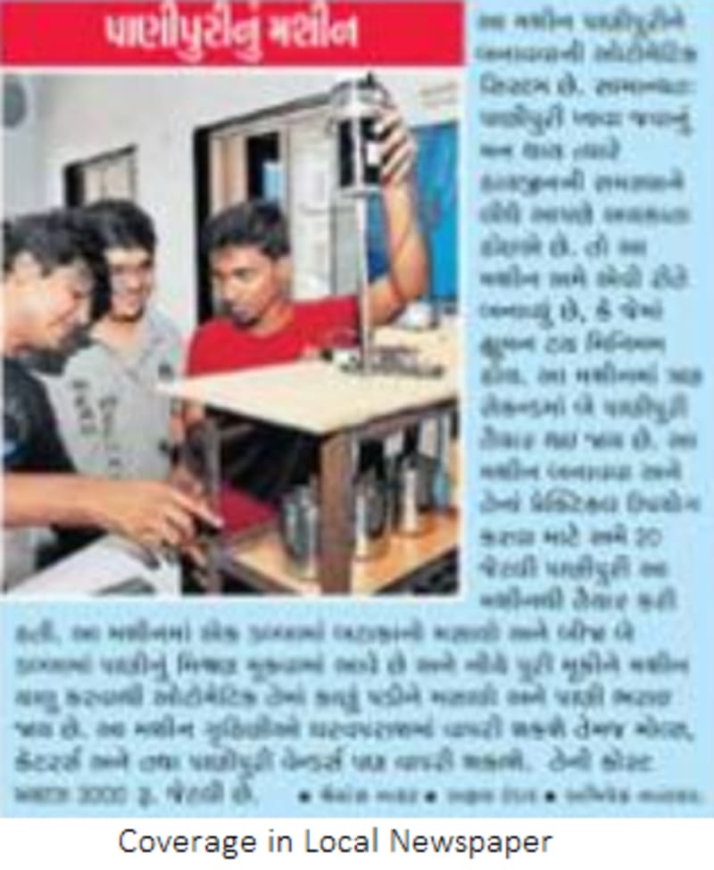 We have developed a mechanism that automates paanipuri vending process for avoiding human touch making it more hygienic and also retaining its core essence. An attached image shows representative diagram of machine. Crankshaft mechanism driven by DC motor carefully makes holes in chips. The second motor drives rack-pinion pushing pistons in the containers. Thus, stuffed chips are ready within three seconds. The number of chips stuffed per round can be increased by increasing number of outlets from the containers. The micro-controller is programmed to control motor’s rpm for delivering paanipuri without jerks and splashes. Our first prototype was a proof of concept displayed at IIT Gn in April, 2014. Next step is to install units (to be manufactured with food-quality materials) at a few locations in Ahmedabad to record consumer behavior.