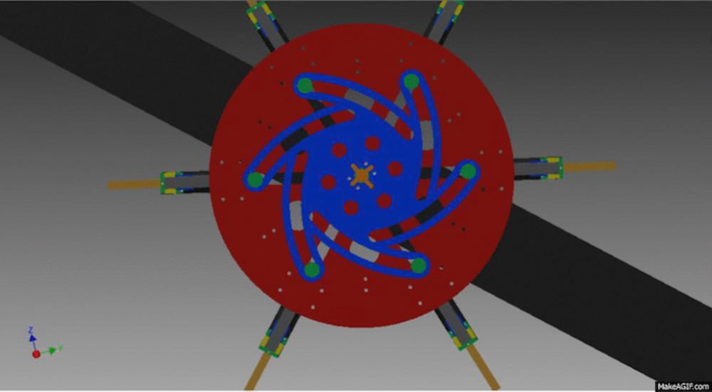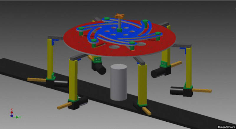 The mechanism which is proposed is a simple two disc mechanism. There are two discs, one of them has radial slots and the other had curved slots. The disc with radial slots is kept fixed while the one with curved slots is rotated. Radial slots define the path of the cameras and the curved slots provide the required force and torque to rotate the disc and translate the cameras. Since there are 6 cameras to be used in the system, there are 6 identical slots in the discs.