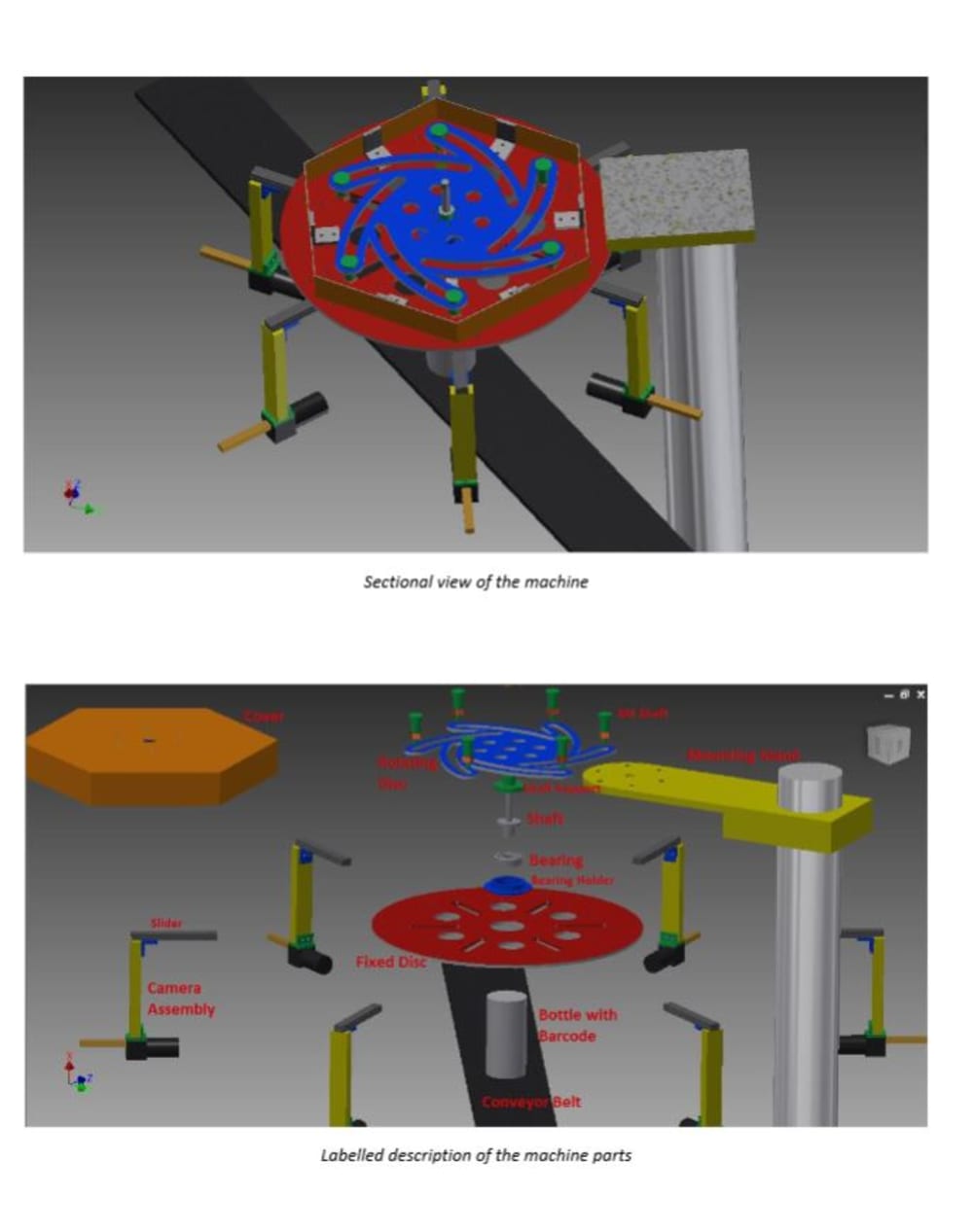 This machine is designed to be used in industries for decoding a data matrix printed on bottles of various sizes. In the system, there are 6 cameras which are used for taking the image of the code from 360 degree (all the cameras are placed symmetrically at 60 degree from each other). This image is sent to the computer where it will be analysed by the software and hence decoded by it. Since there are some limitations on the decoding ability of the software, an image needs to be clear and focused enough to be decoded properly by the software. Hence machine ensures that whatever is the size of the bottle and the code printed on it and wherever the code lies on the bottle, cameras should be able to take image of the code efficiently.