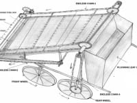 The inclined second frame supporting an inclined sheet metal ending into a collection container supported at rear end on first frame , with a pair of endless chain links running on matching sprockets on two sides of inclined second frame and receiving power at lower end sprocket through connection from the axle into rubber covered axle.